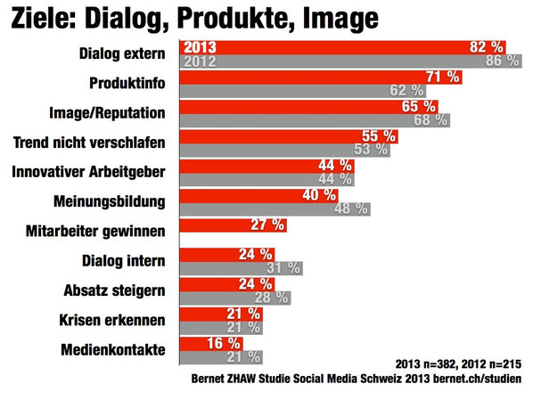 Zum dritten Mal haben Bernet_PR AG für Kommunikation Zürich und das Institut für Angewandte Medienwissenschaften der ZHAW den Einsatz von Social Media bei Schweizer Organisationen untersucht. 881 Verantwortliche aus Unternehmen, Nonprofit-Organisationen, Behörden und Verwaltungen haben den Online-Fragebogen ausgefüllt. Die wichtigsten Erkenntnisse aus den bis März 2013 erhaltenen Antworten: